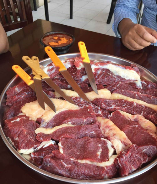 民间的吃法则要斯文很多,通常是把生牛肉切成小方块,吃的时候,左手拿一块肉,右手拿一把小刀,用小刀割下一片片的肉,蘸着面前的辣椒酱吃。他们吃得真是津津有味啊!