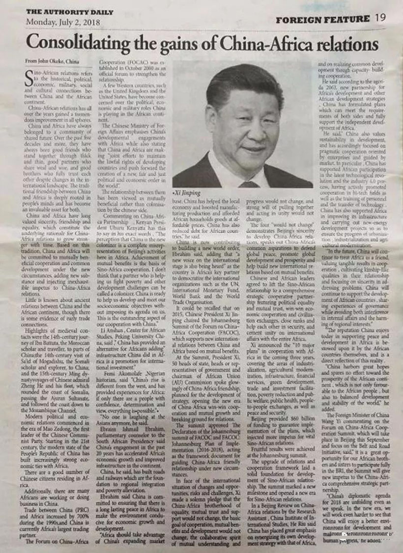 尼日利亚《权威报》(The Authority)近日整版刊发该报记者奥凯凯评论文章,梳理中非传统友谊,盛赞当今中非合作,回顾中非合作论坛约翰内斯堡峰会成果,展望论坛北京峰会,认为中非始终风雨同舟、休戚与共,从来都是命运共同体。