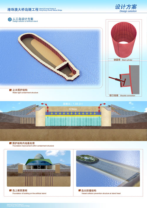 World's first Bridge - Island - tunnel cluster solution: To protect large vessels' the only deep-water lane - Ling Ding navigation channel in these sea, 6.7 km long undersea immersed tube tunnel and 22.9 km long cross-sea bridge, as well as two artificial islands for the realization the conversion of bridges and tunnels.