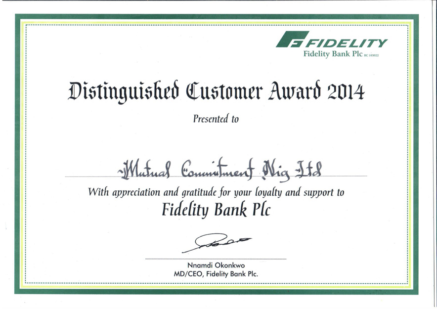 The Group Company Mutual Commitment was awarded the Distinguished Customer of 2014 by Fidelity Bank Plc.