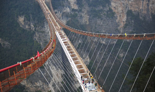 A glass-bottom bridge in Hunan province is set to blow the rest of China’s glass bridges out of the water. The new bridge, across the Zhangjiajie Grand Canyon in Hunan province, will open in the first half of 2016. It will be 400 feet longer, 300 feet taller, and way more knee-rattling than Brave Man’s Bridge — the current longest bridge of its kind in the world.